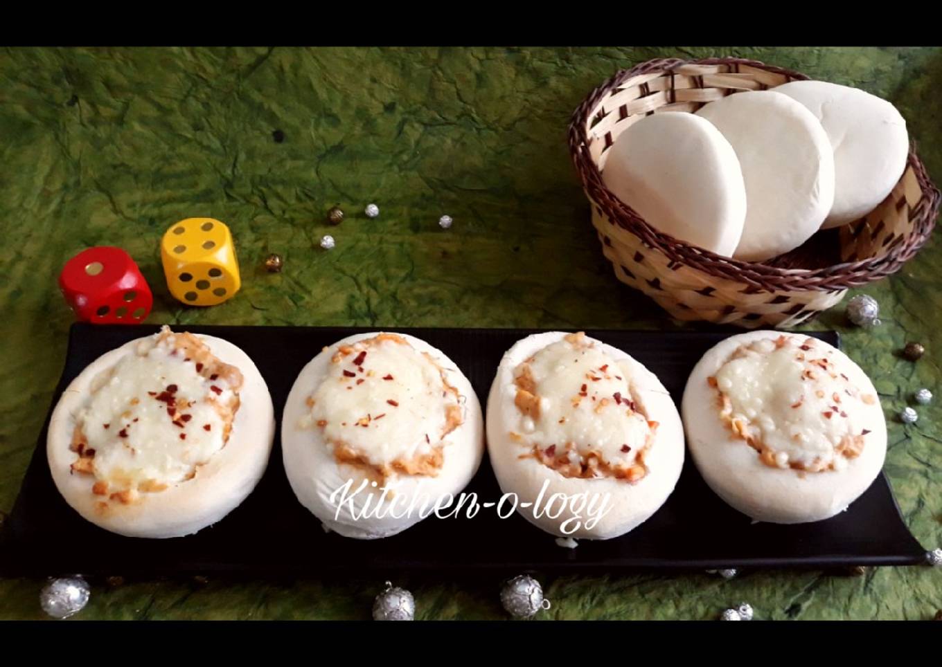 Fill in with chicken filling. Sprinkle grated cheese & chilli flakes.