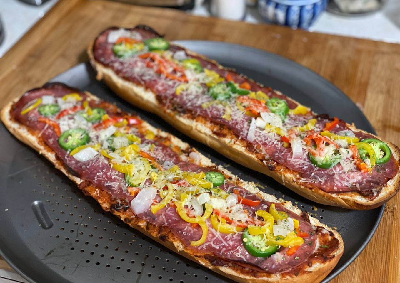 - Preheat oven to 450 F. Slice bread in half lengthwise. Chop and dice veggies. Chop Chipotle peppers and mix a couple tablespoons of adobo sauce into pizza sauce. Spoon or brush sauce onto bread. Distribute cheese evenly amongst both slices. Layer on salami followed by the veggies. Lastly, grate Parmesan over the top.
