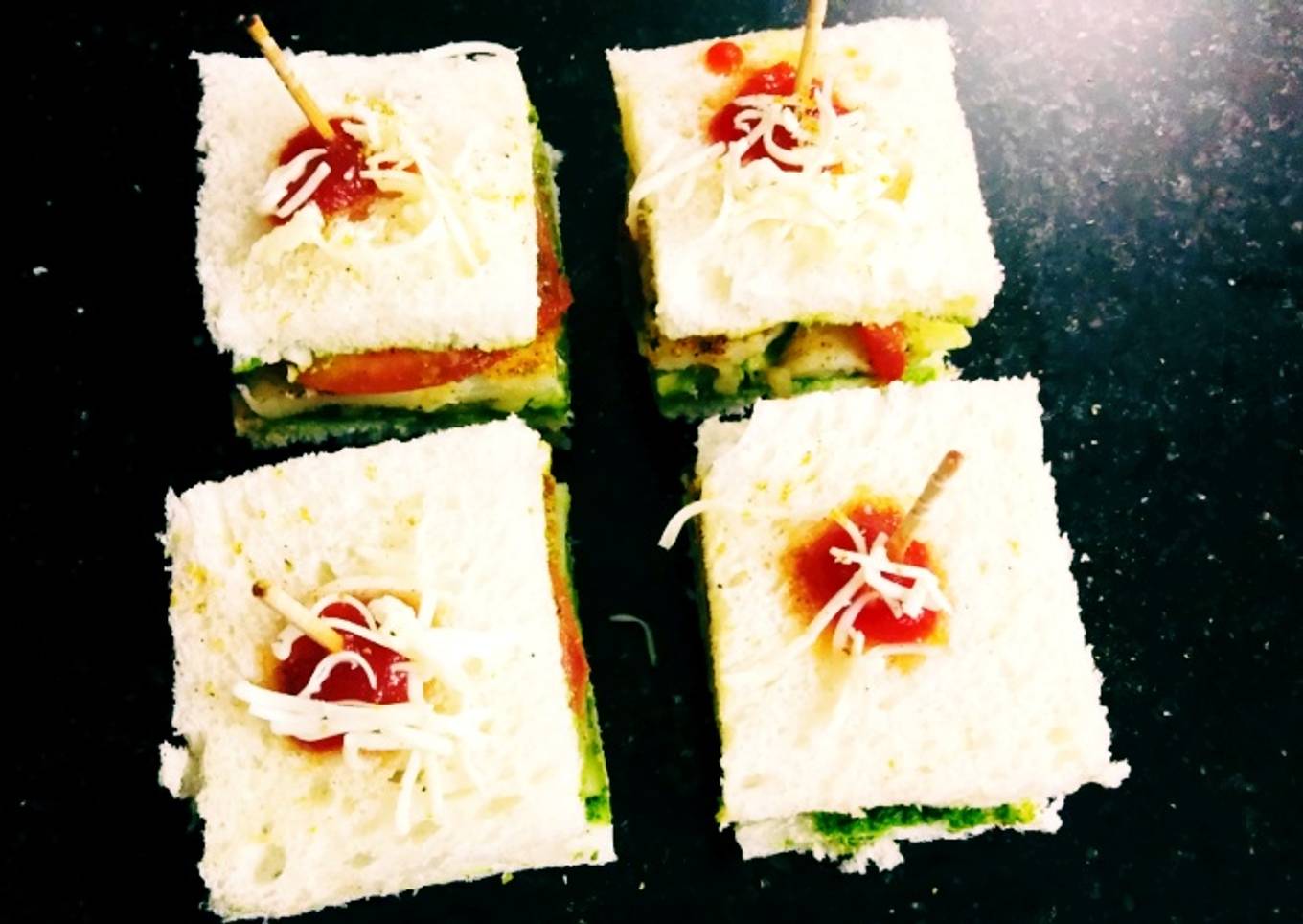 sprinkle the salt and sandwich masala masala on each one of them or alternately.cover the sandwich with the other bread slices. - Slice the veg sandwich into triangles and rectangles