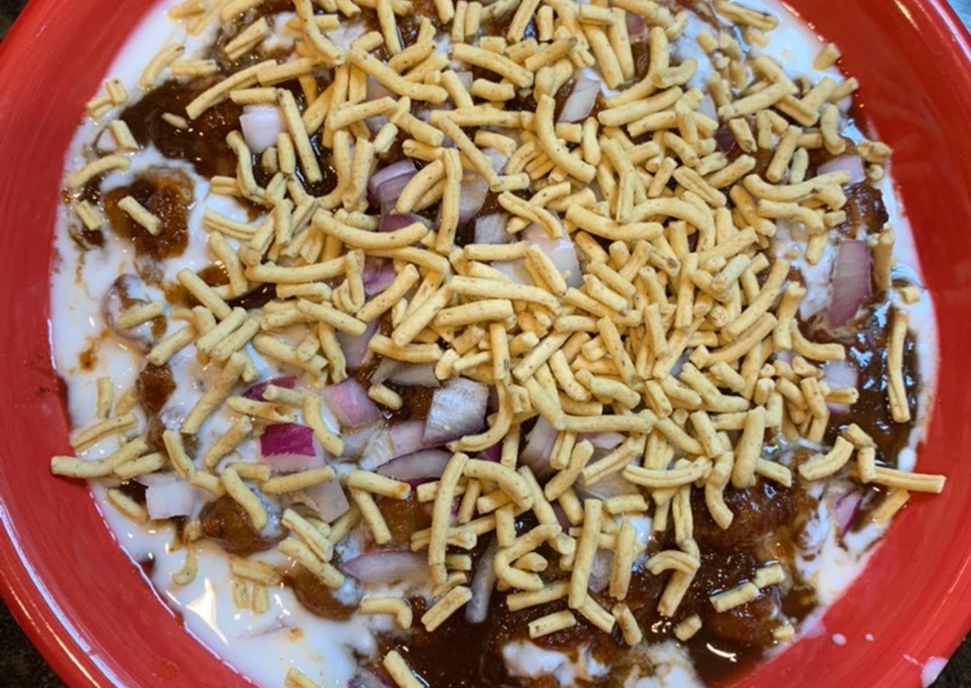 Serve with chole, yogurt, tamarind chutney, finely chopped onions and sev.