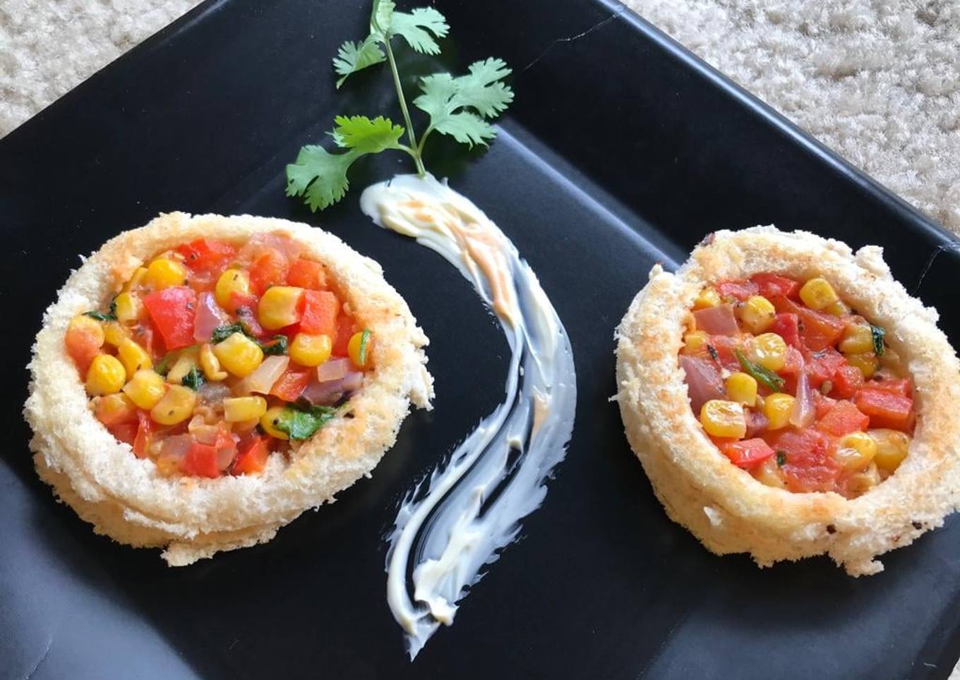 - 2. Cut 2 bread slices into circular discs. Now, make a ring out of one circular disc.On a circular disc, apply some prepared spread and place the ring on it. It will form a cavity. Fill this cavity with the stuffing. Press a little.