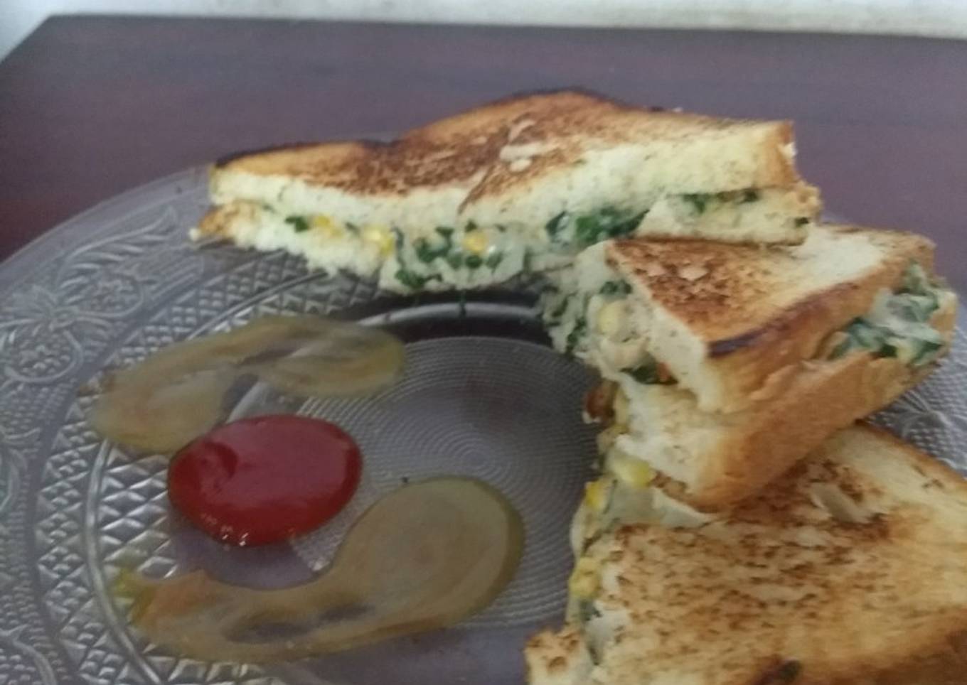 To get started with this particular recipe, we have to prepare a few ingredients. You can cook Spinach corn sandwich using 9 ingredients and 8 steps. Here is how you can achieve it.