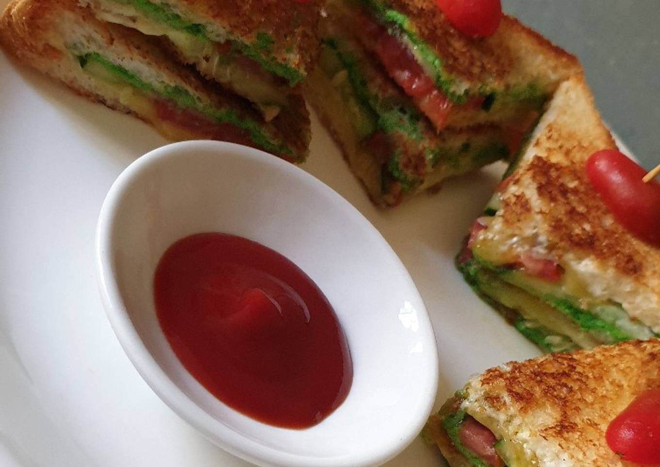 - Yummy cheesy vegetable sandwich is ready to be served hot with tomato ketchup.