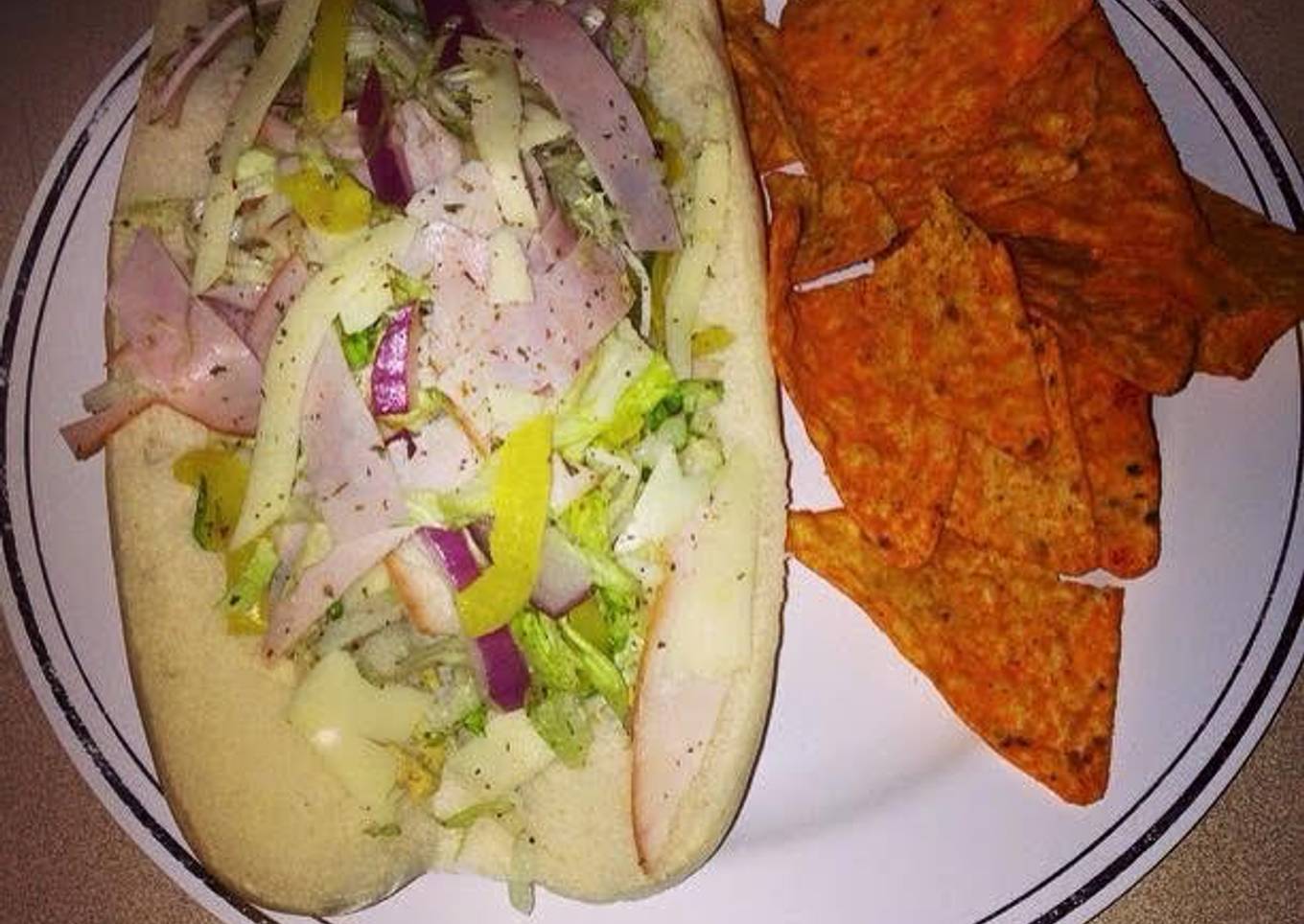 - Then add the sliced meats,cheeses, banana peppers, red onions, etc and sprinkle with more red wine vinegar and Italian seasoning, tomatoes-mix it all up in a big bowl and throw on a hoagie roll. With spicy brown mustard, Mayo, or whatever you like on your sandwich roll. Serve with favorite chips.(Cheese Doritos) ❤️