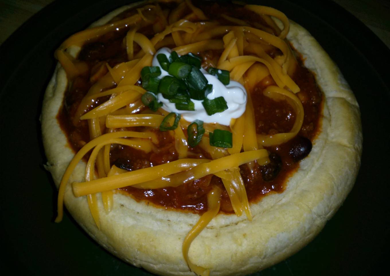 - 10 minutes before your chili is finished preheat your oven to 375°F Fahrenheit and place your bread Chili Bowls on a baking sheet and bake for 5 minutes remove from the oven onto a plate and add some chili in the bowl top it off with some cheddar cheese scoop of sour cream and chives and enjoy