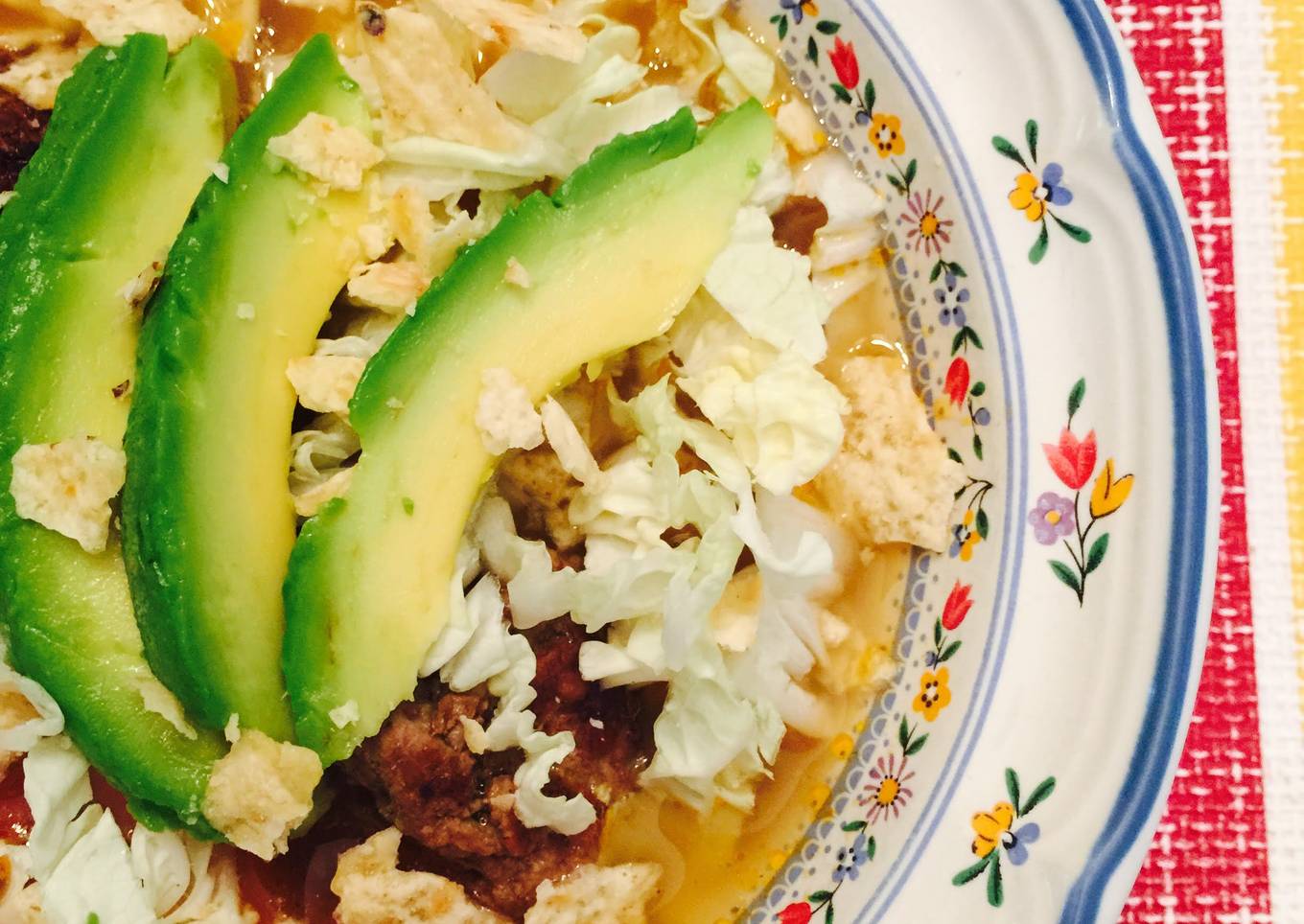 - Serve hot with shredded cabbage, avocado slices and crushed tortilla chips.