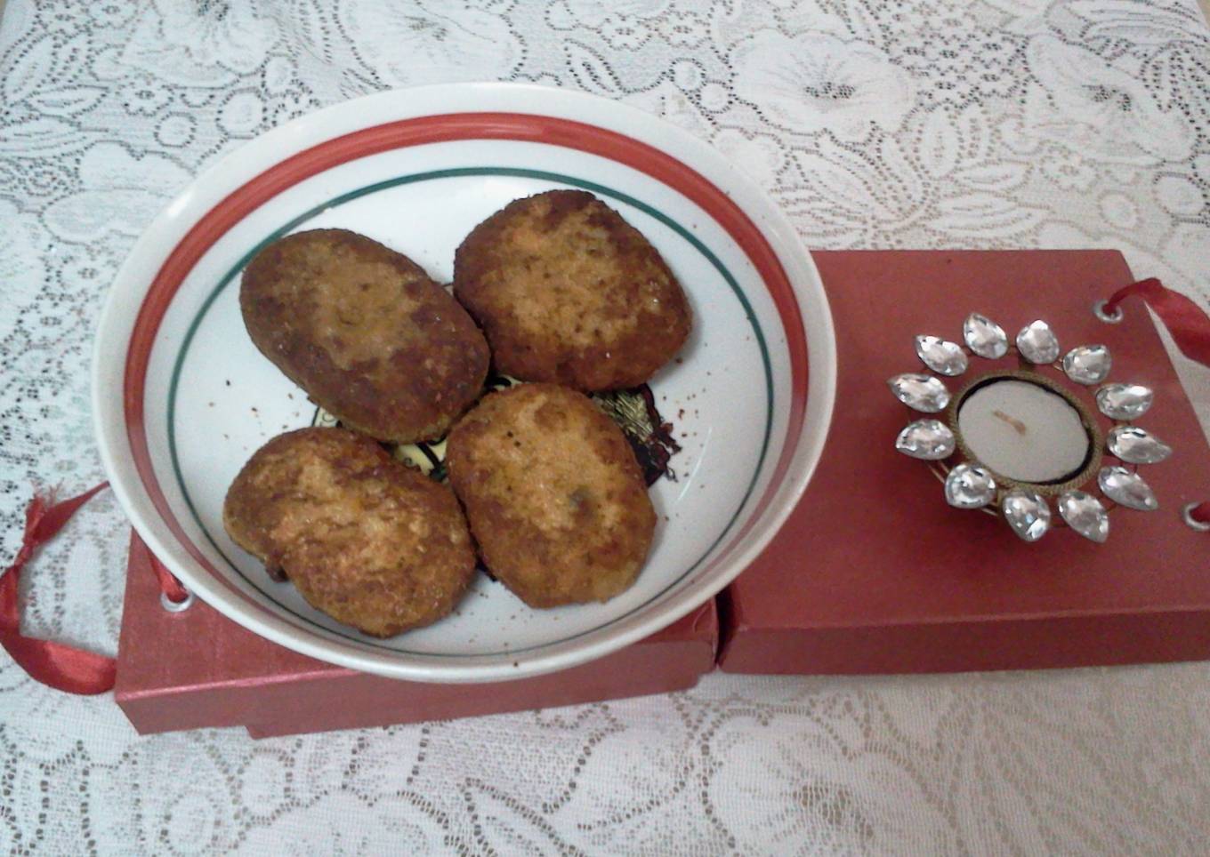 - Now pour the oil in a frying pan and fry each croquette . Make the fire slow and turn both sides.Ensure that both sides are well coooked Take care that it is not over burnt. Alternatively it can also be baked after applying ghee in the baking tray. Yummy snack is ready