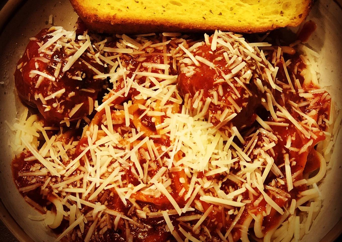 - Pour spaghetti sauce with a good helping of helping of meatballs. Sprinkle with Parmesan cheese and enjoy! Best served with garlic bread!